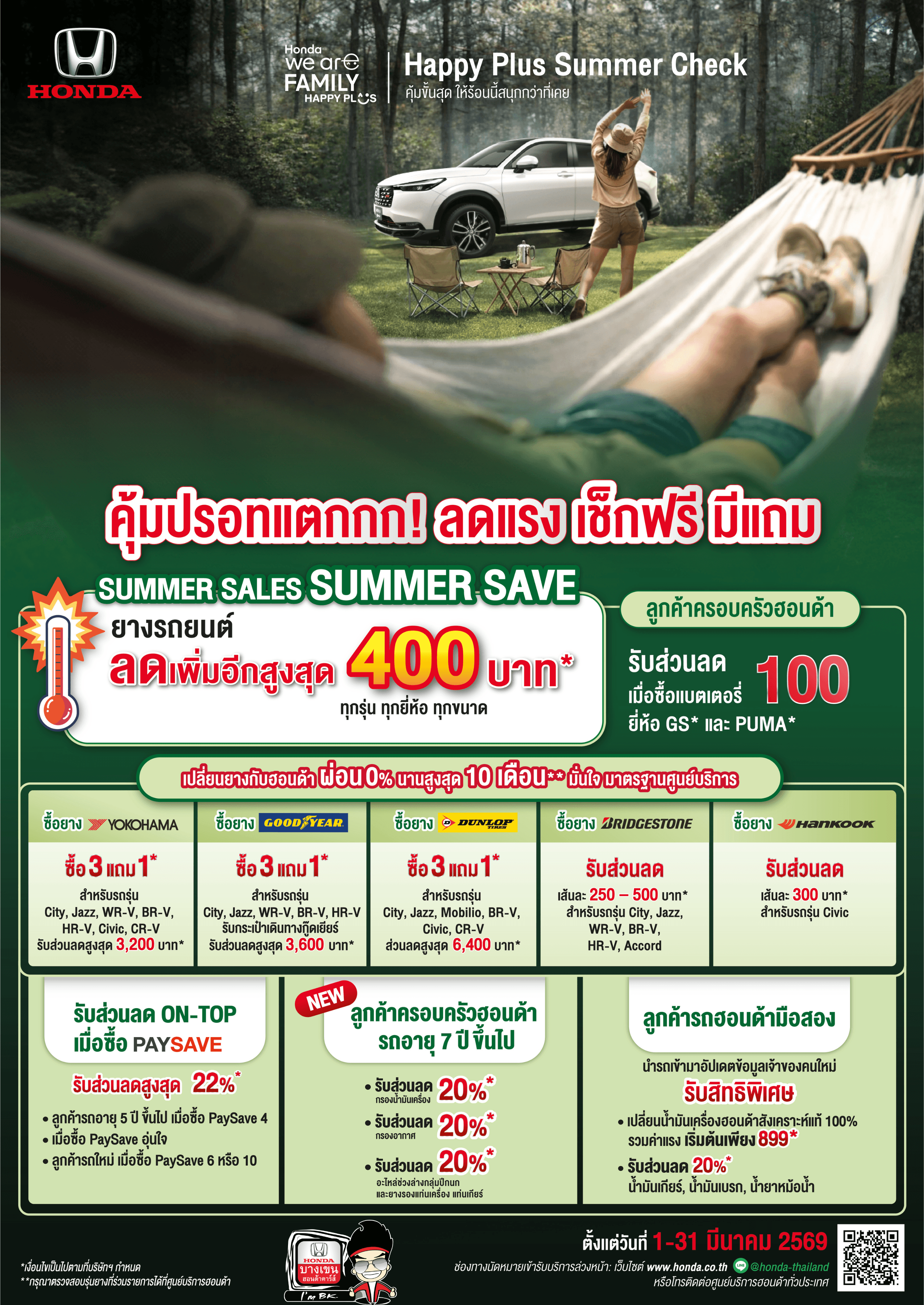 ลูกค้าครอบครัวฮอนด้าทั้งเก่าและใหม่ รับส่วนลดจัดเต็ม ยาง แบต และค่าแรง! แวะมาเช็กสภาพรถก่อนเดินทางได้เลยนะคะ 🚗💨