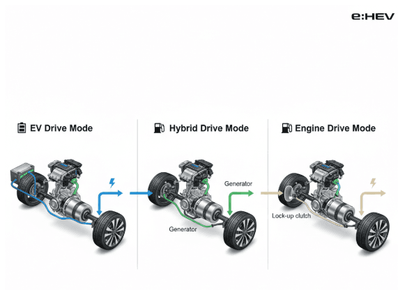 ระบบ e:HEV จะสลับโหมดการทำงานโดยอัตโนมัติเพื่อให้เหมาะสมกับสถานการณ์การขับขี่ที่สุด